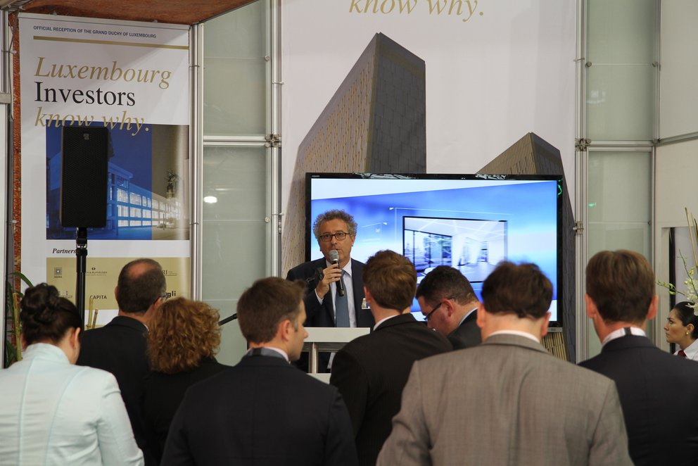 Gleich im Anschluss fand der offizielle Empfang am Luxemburgischen Gemeinschaftsstand statt, der dieses Jahr wieder zahlreiche Besucher anlockte. In Zeiten in denen Investoren vor allem auf Sicherheit und 1A-Lagen setzen, stellte Pierre Gramegna, Hauptgeschäftsführer der Handelskammer Luxemburg, die politische Stabilität, das hohe Ansehen des Finanzplatzes sowie das AAA Rating des Standortes Luxemburg in den Vordergrund. Pierre Gramegna sieht die Bedeutung des Standortes dadurch bestätigt, dass zahlreiche ausländische Investoren ihre europäischen Aktivitäten in und über Luxemburg steuern. Fonds und Banken erkennen die Vorzüge des Finanzplatzes Luxemburg und siedeln sich nach wie vor im Großherzogtum an, wie das jüngste Beispiel der China Construction Bank belegt. Auch bei den verwalteten Vermögen verzeichnet der Finanzplatz einen konstanten Anstieg.